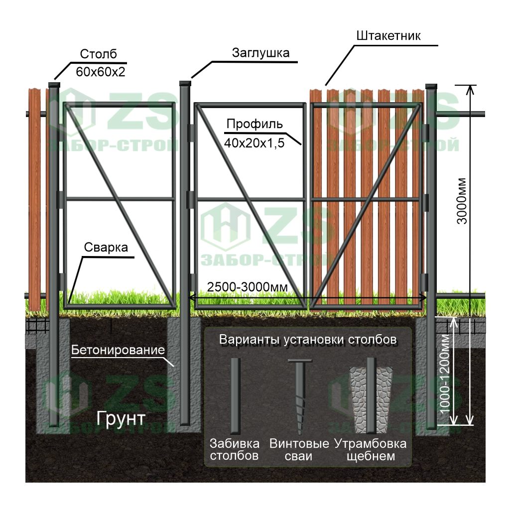 Конструкция распашных ворот с калиткой из евроштакетника: