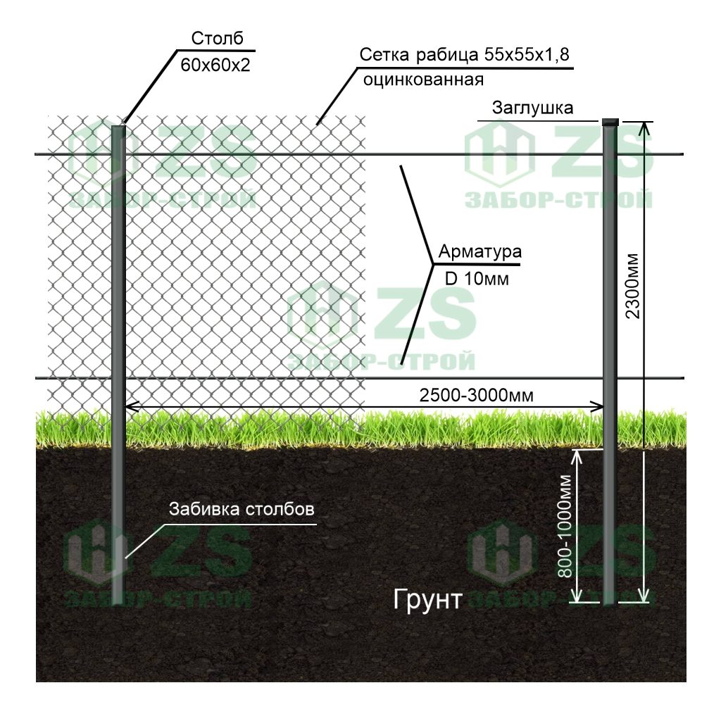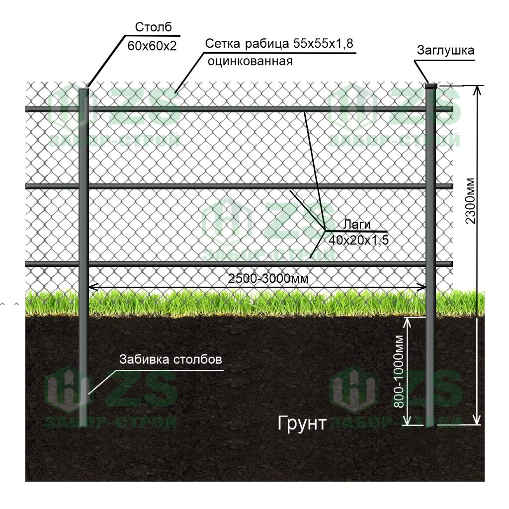 Конструкция забора из сетки рабицы в натяг: